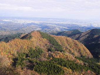 展望台から紅葉の山々を眺める。 |