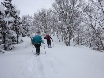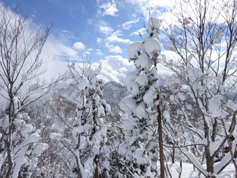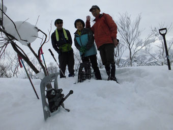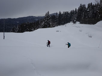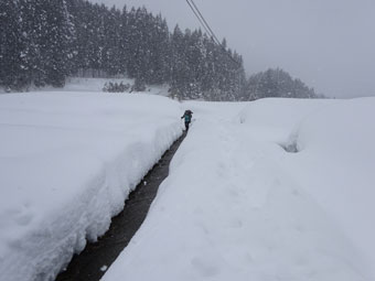 西種集落手前の十字路(バス停)の片隅に駐車し、消雪のための流水に靴が濡れないように集落内を歩いた。集落を過ぎると、想像以上の雪量に驚きながら、スノーシューを装着する。前日のものか定かでないが、トレースがあり、深く沈まなくてすんだ。