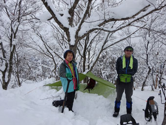 終始元気者の河原氏に先頭をお願いする形となった。それが奏功してか、2時間半余りで山頂に達する事が出来た。当初は、タッチだけして、ターンしなければならないのではと思っていたが、1時間以上の余裕が出来、タープを張る事にした。900mの山頂からは、本来なら剱岳が望めるのであるが、今回は、酷く降らなかっただけでも良しとした。