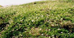 遠望の山々は、はっきり姿を現してくれないが、綺麗なお花畑の始まりである。この頃から、昨夜、朝日小屋で泊ったと思われる登山者とすれ違うようになる。