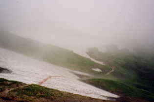 長栂~黒岩間は、また何時の日の楽しみに残して、また、当初の予定通り、朝日岳登頂は、体力、時間的、天候の事もあり断念!「頂上着が1時を回っていたら、どうしただろうか!」と、考えながら、吹上げのコルに戻った時は、一面ガスに覆われてしまった。