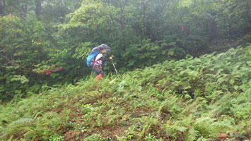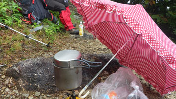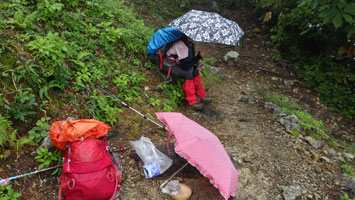 今日は、雨でも、大降りしないと見込み中山としたが、風もなく傘を差しながら歩く事が出来た。食事をする時や、コーヒタイムでは、傘を差す事が出来ないので、上だけ雨具を纏った。小雨・霧雨でもザックはビシャビシャになった。