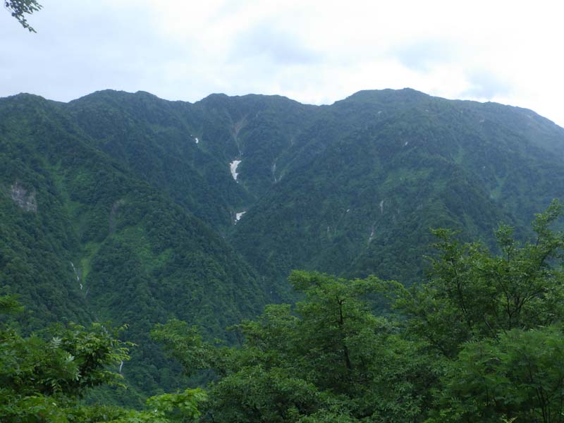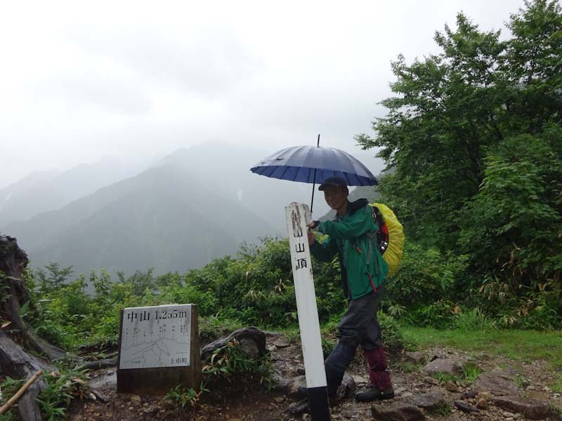 7/6 一日中雨の予報は、朝早く起きてもテンションが上がらない。行き先にも思案して決まらない。「山ノ神」に無理矢理決めさせたのが中山である。早月川の流れも、ゴーと凄い音を響かせていたが、水の色はまだきれいだった。雨が降っていても、馬場島近くでは、剱岳の稜線が見えた。