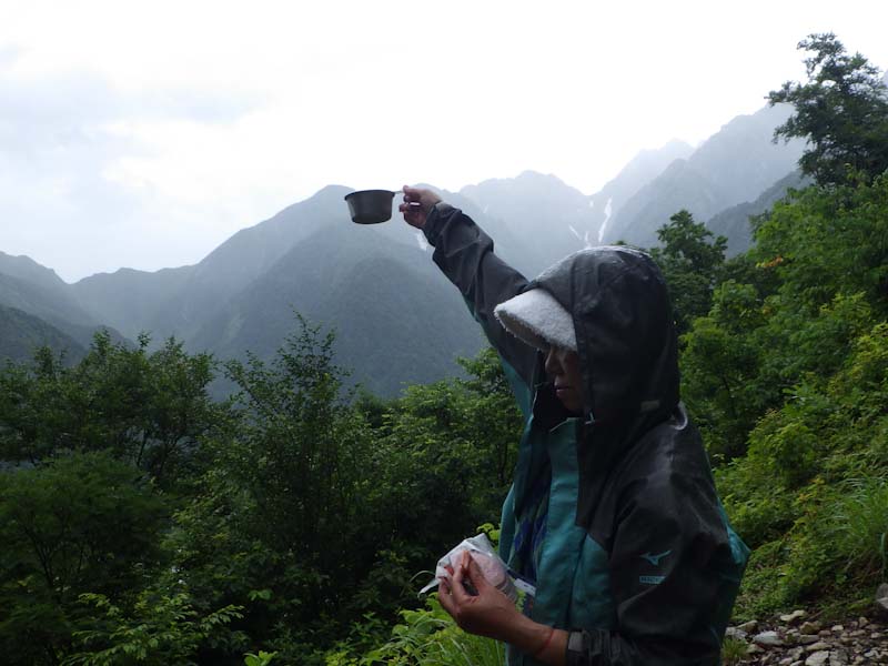 雨は強くなったり弱くなったりであったが、怯んでしまうような降り方ではなかった。それでも、山頂での食事をパスする雰囲気であった。1100m下の展望が効いて広まった所で、お湯を沸かした。止んだかに思えたが、また降り出した。でも、「山ノ神」は、どうしてもビールを飲みたいらしかったので留まる事にした。コーヒーを飲みたかったし。