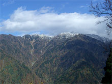 落葉をサラサラと踏みしめながら、広がる視界は、昨日からの冷え込みで、やはり高所では雪になった様子を教えてくれた。赤谷山まで白くなっていたが、ブナクラ峠には、まだ雪が降りて来ていないようであった。しかし、それよりも低い細蔵山の上部は白くなっていた。