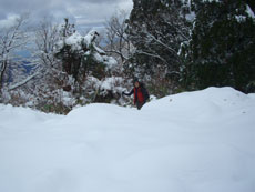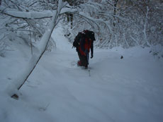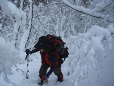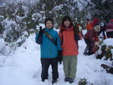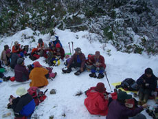 雪上で思い思いの食事をする中、先程の若い二人の女性が、我々の横で、何だか寒そうにじっとしていた。ラーメンを作り始めても、その女性達が気になり、また、よからぬサービス精神が出て、「良かったら食べませんか・・」 と差し出してみた。 普通なら、「いいです。」 と断られるのが落ちであるが、「有難う。」 と言って食べてくれた。話をする内に、中山は簡単な山だから、「車に戻ってから食べればいい。」 ような段取りだったらしい。しかし、登ってみると、積雪も手伝いなかなか計算通りにはいかなかったようである。
