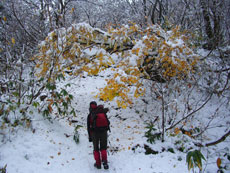 11/3 寒波襲来の予報に、ちょっと出遅れてしまい「中山」となった。新潟市内からの団体(20~30名)を抜き、そして、若い二人の女性を抜いてから、真新しい雪を踏む事になった。例年の文化の日なら、山頂は溢れんばかりの登山者で、休憩する場所もないと聞いているのであるが、今日は、その後に単独行が3名だけだった。
