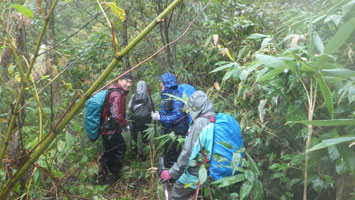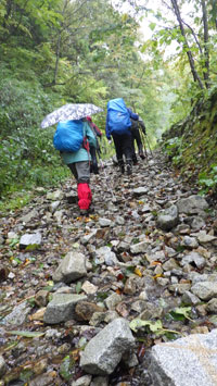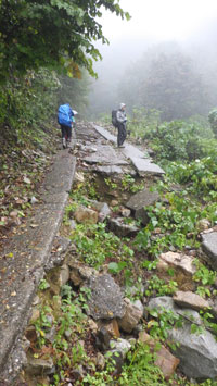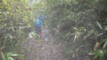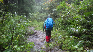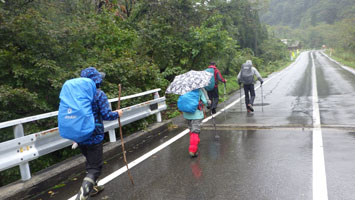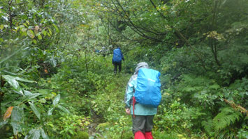 僅か40分程の休憩(食事タイム)であったが、温かい物を口に入れる事が出来たからであった。雨は強弱を伴って降り続いていた。じっとしていると寒さを感じた。さて、午後2時発であった。これからが心配であったが、皆の協力を得て無事に降りて来られた。オーバーかもしれないが、半分余で降りて来たのである。