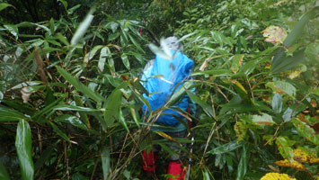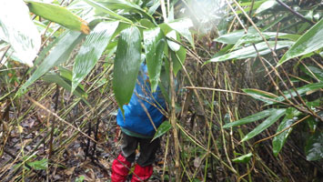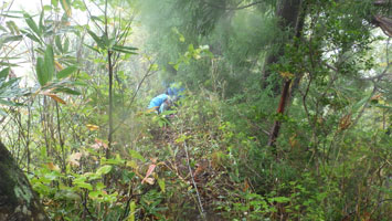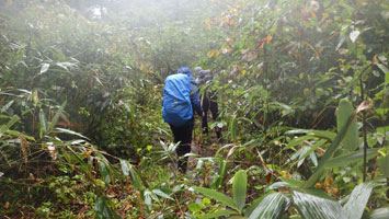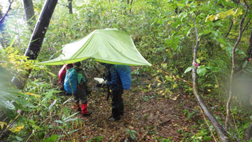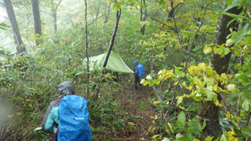 殆ど、休憩もない(2回程あったか?)ペースで山頂に辿り着いたのは、車から離れて4時間ほどであった。小さな山頂(1,335m)、何もない山頂、しかも雨である。記念に写真を撮って、100m程降りた平坦な所で食事となった。(午後1時20分頃) 岩城君と池原氏が先に降り、タープを張ってくれた。北ちゃんは、「山ノ神」のガイド役となった。