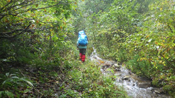 そこからは、小枝や草木を掻き分けなければならず、折からの雨で、沢横または、沢の中を歩かなければならなかった。通常、臼越山に至る時、林道を迂回せず、大斜面に取り付くのであるが、流石にこの時期はそんな事は出来ず、林道経由になる。残雪期は、その林道が、まるで車が入るような雪原となるが、無雪期は、ナンジャラホイとなっている。