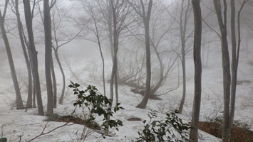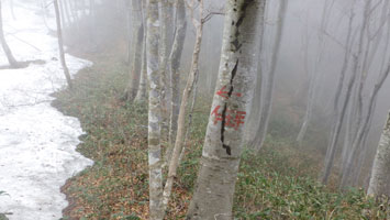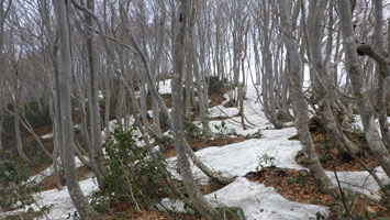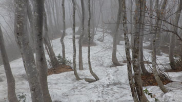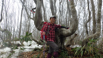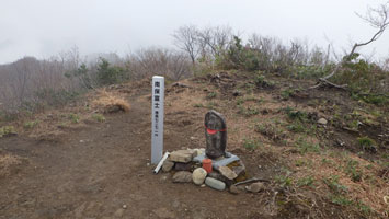 降らなかったし、薄日が差したりしたが、山頂からの展望は全く無かった。正午まで、車に戻る予定にして、僅かな時間をもらって私一人、二王山に向かった。南保富士と、高さがそんなに変わらないのに、かなりの残雪があった。山頂は、雪の無い時より雪があった方がいい。山頂らしい。