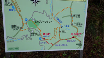 林道工事現場8:40=登山口9:00=南保富士頂上(10:10~20)=二王山頂上(10:40~50)=南保富士頂上(11:10~20)=登山口12:05=工事現場12:30