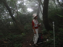 夕方から雨の予報通り、ガスに覆われた山中と言うより、夕暮れの山中に入って行く感じであった。蒸し暑く、チョット歩いただけで、汗びっしょりである。