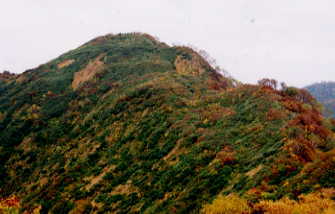 この頃から、樹木の色付きがだんだん良くなってくるのだが、登山道にヤブがはびこってきた。所々に目印の赤布が付けてあるのだが、イヤな感じである。半袖姿では、とても我慢が出来ずリックの中から長袖シャツを取り出して着込んでしまった。小枝を掻き分け数回のアップダウンを繰り返し最後の長い階段を登り切ると見越山の頂上に出た。