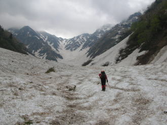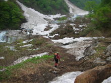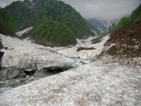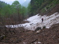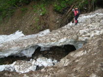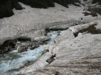 | 林道には残雪がびっしり | 林道から谷へ降りる | スノーブリッジを渡る | 今にも崩壊しそうだ! |