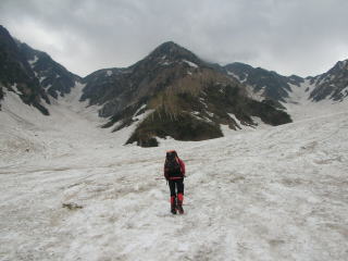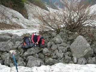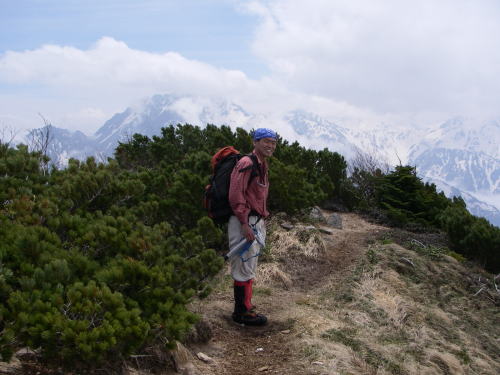 | 「宮ちゃん」大猫山へのルートを見上げながら 重荷を背負って登った事を回想していたらしい |