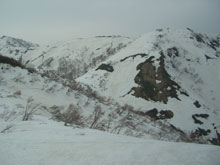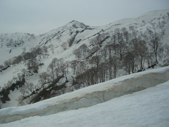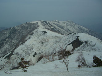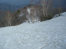 人形山と三ヶ辻山を登り終え、その分岐に戻ったのは、登山口を出発してから、4時間半であった。各々の山頂で20分程の滞在であったが、特別の食事時間を取ったわけでもなく、梯子坂を降りた所で、三ヶ辻山を眺めながら腰をおろした。その山頂を眺めながら、往路で崩落しそうな雪庇上を歩いたが、復路は、面倒であったが、ヤブ中に求めた事は正解であったと勝手に頷いていた。