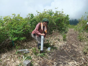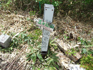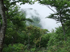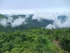 | 第二休憩所の標柱は、囓られていた。 | 第二休憩所から人形山頂を望むが・・・ | 宮屋敷跡付近から、雲に覆われる山々を・・ |