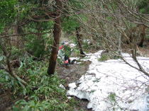 登山道を出たり入ったりしながら、第二休憩所から宮屋敷跡に向かったが、標高差にして、あと50m程の所から雪を拾ったばかりにヤブに突入してしまった。もう少しの所まで行ったと思うのだが、ヤブが苦手な私達は、潔く退却し途中から登山道に戻り宮屋敷跡に駆け上がった。