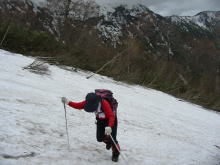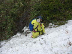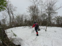 1601mの標高点から20m程下った所から梯子坂が始まる。雪が溶けカタクリが咲いていたが、チョット登れば一面また雪である。雪の斜面で切れ落ちているように感じる所は「山ノ神」の苦手な所。どれだけ大丈夫と言っても足が動かないようである。雪中に出ている木々の赤いテープを頼りに、「三ヶ辻山」との分岐に出たのが午後2時であった。