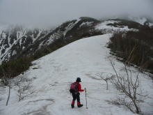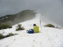 大笠山・笈ヶ岳方面がパーっと明るくなったと思ったが、またガスに覆われてしまった。やや遅い感じだが、午後3時まで、この三ヶ辻山との分岐まで戻るという条件の元に、人形山頂上にに向かう。20分ほど進んで、あと頂上まで10分くらいの所で、「山ノ神」がリタイヤすると言う。“私が一緒だと余計な時間が掛かるから・・”が理由であるが、果たしてどうなのであろう。