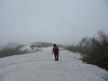 30分も登るとイワウチワやタムシバが目を楽しませてくれ、標高1100mあたりから残雪が現れたが、登山道を覆い尽くすものでなく、「第一休憩所 1,218m」にも雪が殆どなかった。10分間の休憩中、頂上付近を見上げたが、完全にガスに覆われていて先行きが不安であった。ポツリと雨が来たが、まだ雨具を着るようではなかった。