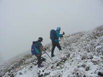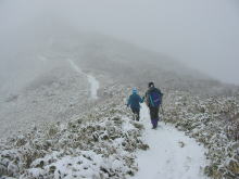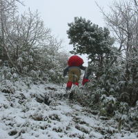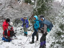 それでも厚着をしていた人は、頭から湯気まであげていなかったが、汗が顔から落ちていた。標高1200m前後の第一休憩所に着いた頃から、雪が降り出し雨具着用となった。