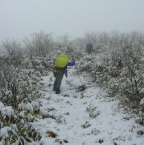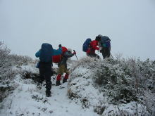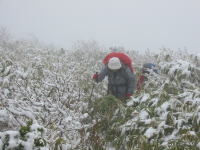 「もう少し!」などの声が飛び交いながら、雪の重さでササが覆い被さっている登山道を行く。雨具着用でない者は、その冷たさに悲鳴をあげていた。