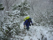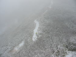 宮屋敷跡から先は、雪量が増えるものの、急登箇所では雪の着きが悪く、結構歩きにくかった。梯子坂に差し掛かる頃には、視界がかなり悪くなり、良いアングルでカメラのシャッターは切れなかった。