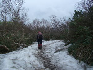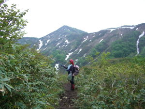 登山口辺りでは、お化けのように伸びてしまっていたが、上部では、所々に残雪があるように、ちょっと早かったのかもしれない。でも、「あそこにある。」 「あの高いところにも・・」 などと、私を使い回すのである。