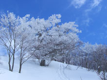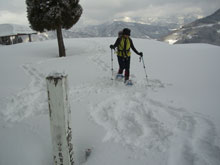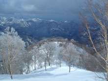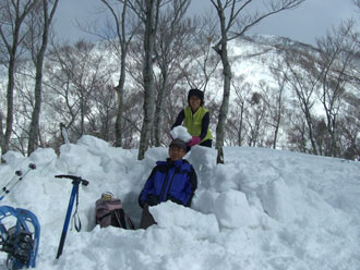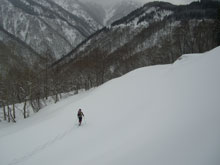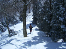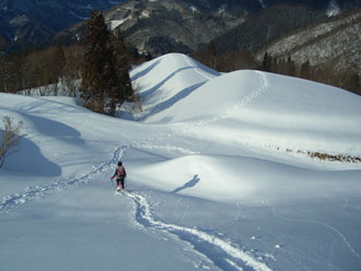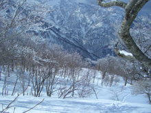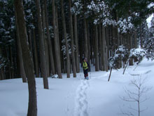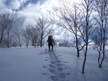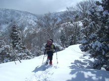 クラストした雪面に、新たな雪が20cm程積もり、樹木の間を縫って行くのは、実に気持ちがいい。しかし、山ノ神のペースがだんだんと落ちていった。一旦、歩き始めると、食する事が出来ない山ノ神であるが、車中の1時間内に、予定の食事が出来なかったのである。