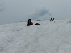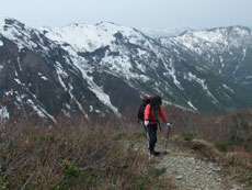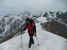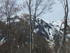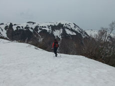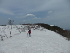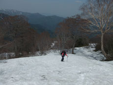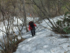 第一休憩所を過ぎると、残雪量も増え、 枝木の煩さが次第に少なくなっていった。 |