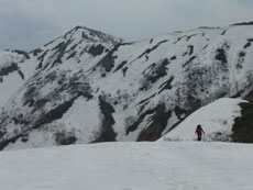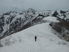 梯子坂に向かって歩いているが、前面の 三ヶ辻山を眺めながらの歩きは、 雪の人形山のメーンのような気がする。 |