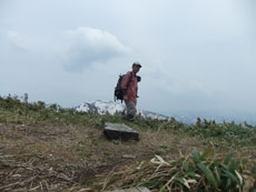 | 「山ノ神」休憩場所を求めての歩き。 | 三ヶ辻山との分岐から人形山方面を望む。 | 三ヶ辻山をバックに、人形山の山頂で。 |