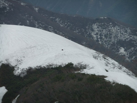 | 山頂と三ヶ辻山への分岐までの稜線から、「山ノ神」が待機する場所を見下ろす。 |