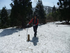 | 雪に埋もれた第二休憩所の標識。 | 第二休憩所から人形山の稜線を望む。 | 宮屋敷まで、べったりの雪が続いた。 |