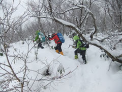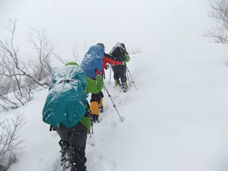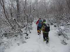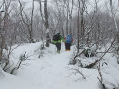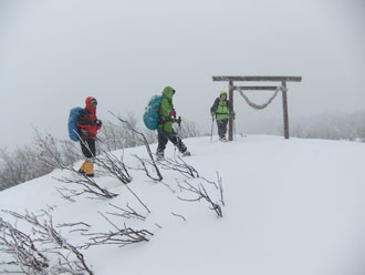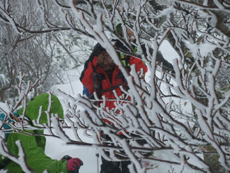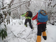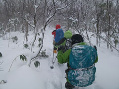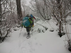 11/18 ずっと雨。集合場所の上梨・村上家でも雨だった。「止めようか。」 などの声は全く聞かれないまま、登山口に着けばミゾレとなった。登山口での雪の状態は、殆ど無いようなものであったが、高度を上げれば徐々に雪量が増えて来た。