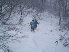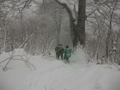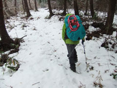 雪嵩が膝下に達した第2休憩所でカンジキを装着し上を目指す。宮屋敷まで3時間余で、その後の判断が難しいところであった。そして、雪が深くなっていった。その後は、1時間程の行軍でピリオドを打った。三ヶ辻山との分岐どころか、梯子坂にも到達出来なかったのであるから・・・