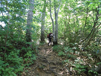 でも、今日は、時期的にも、コシアブラ採りの最終日だと思ってやって来ただけに、山頂まで行かなくても仕方がないのである。しかし、そのコシアブラも伸びきってしまったものが多く、一寸残念な感じであった。そうなると、いつものパターンとなり、途中から、私だけが山頂を目指すことになるが、コシアブラを見付けると、どうしても、その収穫になってしまい稜線分岐までとした。