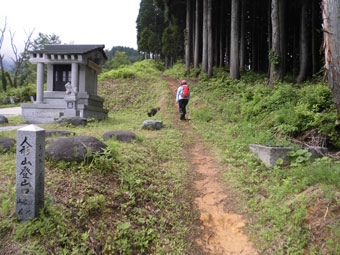 午前9時45分のスタート時点では、暗雲立ちこめていたが、何とか目的地付近まで、我慢してくれないかと思いが叶わず、第2休憩所辺りからポツポツ降り出して、宮屋敷跡を過ぎてからは、ちょっと雨具が欲しいくらいになってしまった。私はスパッツを着けていた事もあり傘で凌いだが、「山ノ神」は上下の雨具を着込んだ。それはそれは暑い事だと思う。