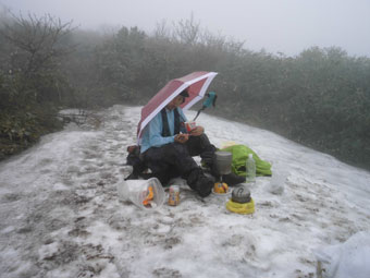 「もうちょっと・・もうちょっと・・」 の誘導には、「山ノ神」は、痺れを切らしたのか、「もうここで良い。」 と立ち止まってしまった。残雪が有り虫除けの効果が期待出来ると思ったのか、「山頂はいいです。何回も登っているから・・」 で話は決まってしまった。