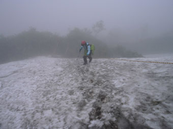 梯子坂上部の雪渓を行く。 |