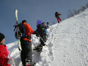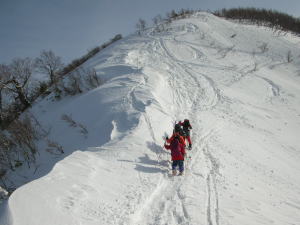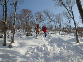 | 「やっと、視界が開けた!」 | 意外と急登! 皆、喘ぎ喘ぎだ! | 「登り詰めれば一休みだ!」 |