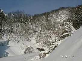 小川側の小さな雪庇を気にしながら、反対側の斜面は、無雪期には広葉樹の葉の関係でさほど気にならなかったが、結構凄い角度で切れ込んでいる。急登の個所で、雪の上にトラ縄が僅かに顔を出していた。ここが辛い所で、駆け上がろうとしても雪が崩れてきて、おまけに下の所が硬い。嫌な感じの所で、帰りの事を思い、足場を造っておいたが、上から下を覗けば、滑ったら、真っさかさまに、谷へ吸い込まれていきそうな感じだ。