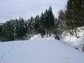 明日温泉からは、産業廃棄物処理業者の大菅建材までは、車が入るという事前情報があったので、「負釣山」行きにした経緯があるのだが、除雪はしてあるものの、ツルツルの1車線の道をユルリユルリと進む。処理業者の事務所まで1.4㌔。その先0.6㌔まで入れ、除雪車が、排雪またはUターンをした場所と思える広まった所に車を止めた。