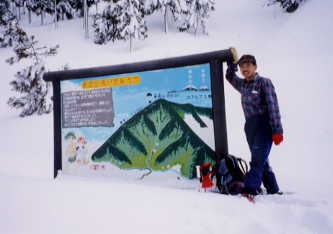 林道を忠実に進み、やがて確実に真上に林道があると思える斜面を駆け上がると作業小屋があり、その先に小さく案内板が見えた。そこがオコ谷の峠で、ショートカットしても1時間20分を要してしまった。(積雪150㌢)