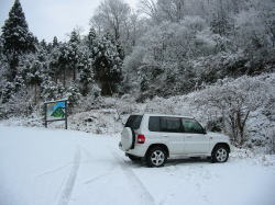 「バーデン明日」付近に来ると、雨に雪が混じりその奥に入ると雪になった。西尾根との分岐から林道が白くなり、オコ谷の駐車場では10cm近くの積雪となった。このような日に来る人は、やはりいないようである。