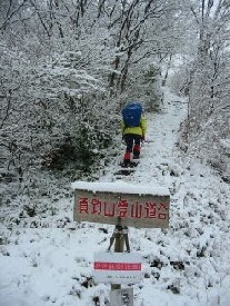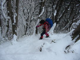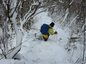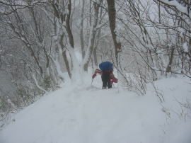 登山口から約1時間半のまずまずのタイムで、七合目に到達したのであるが、「山ノ神」が登頂を断念すると言い出す。過去に、この上部でいやな目に遭った事が脳裏を過ぎったのか、それとも今日の虎ロープの登りで、マズイと感じたのかもしれない。また、この頃より視界が悪くなった事や、降雪が強くなったのも原因したのかもしれない。