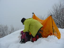 そうなれば、一時間以上過ごすのに、ツエルトを張って、コンロ・ガスや食料を渡していかなければいけない。私はカメラ機材と簡単な食料(非常用)などを持ってカンジキを着けた。