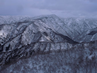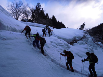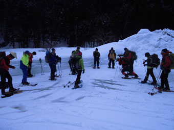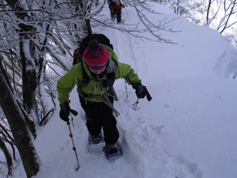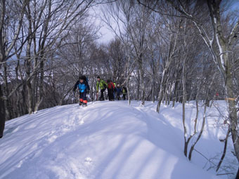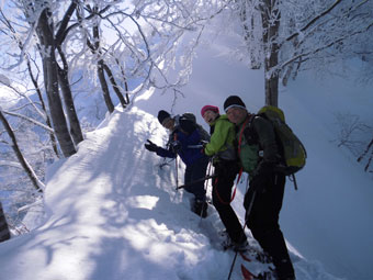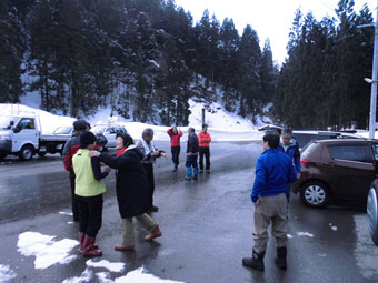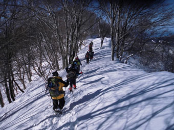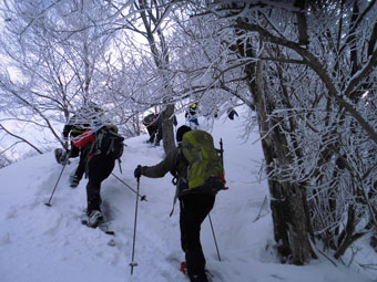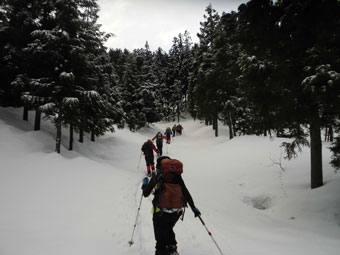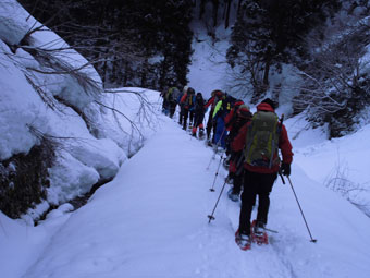 | 林道取り付き地点で、リーダーの挨拶! | 林道歩きは、それ程のラッセルが伴わず快適。 |